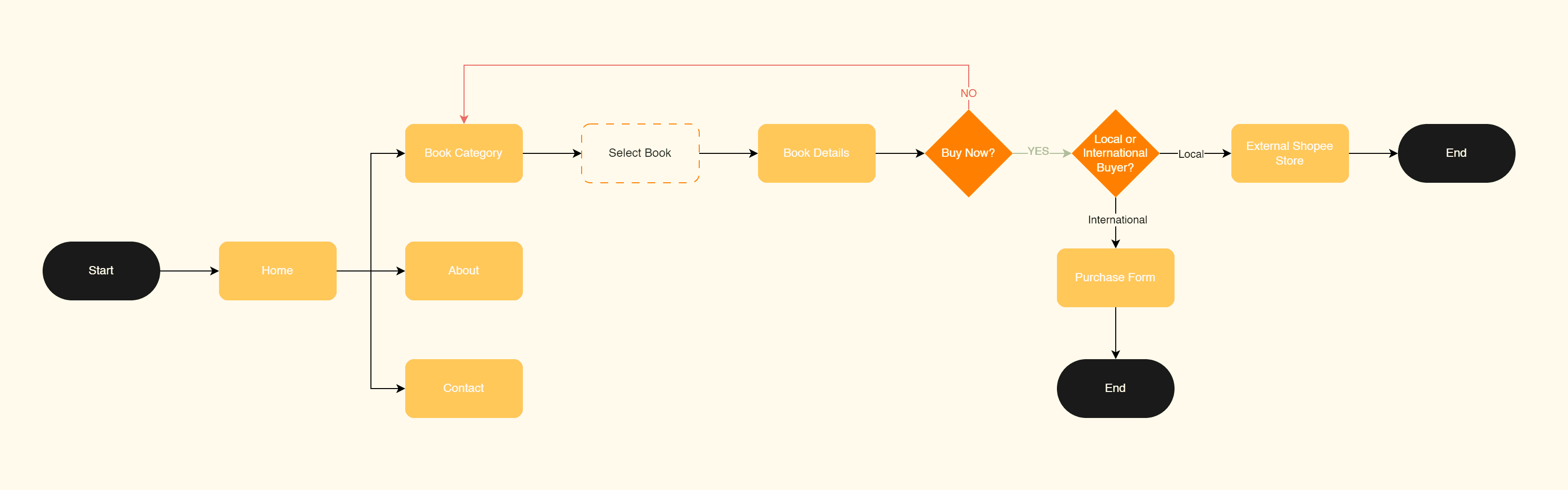 From the information gathered throughout the research phase, I was able to generate a user process flow. This was designed to help me understand the sequence of actions needed for users to successfully reach their goal while pertaining to Nutmeg Books’ needs.