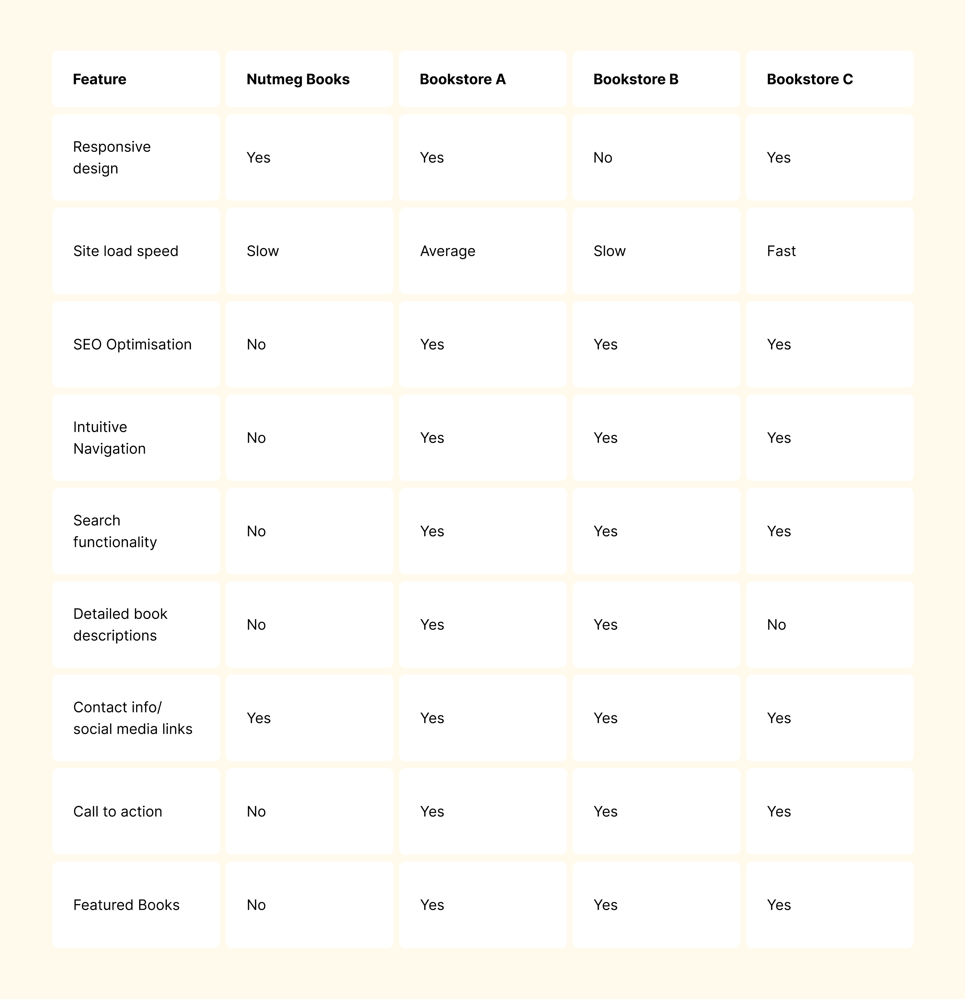 Looking across the board, features like intuitive navigation, search bars, and calls to action aren’t optional, but they’re standard. Bookstores A, B, and C all deliver on these, which makes Nutmeg’s gaps even more noticeable.